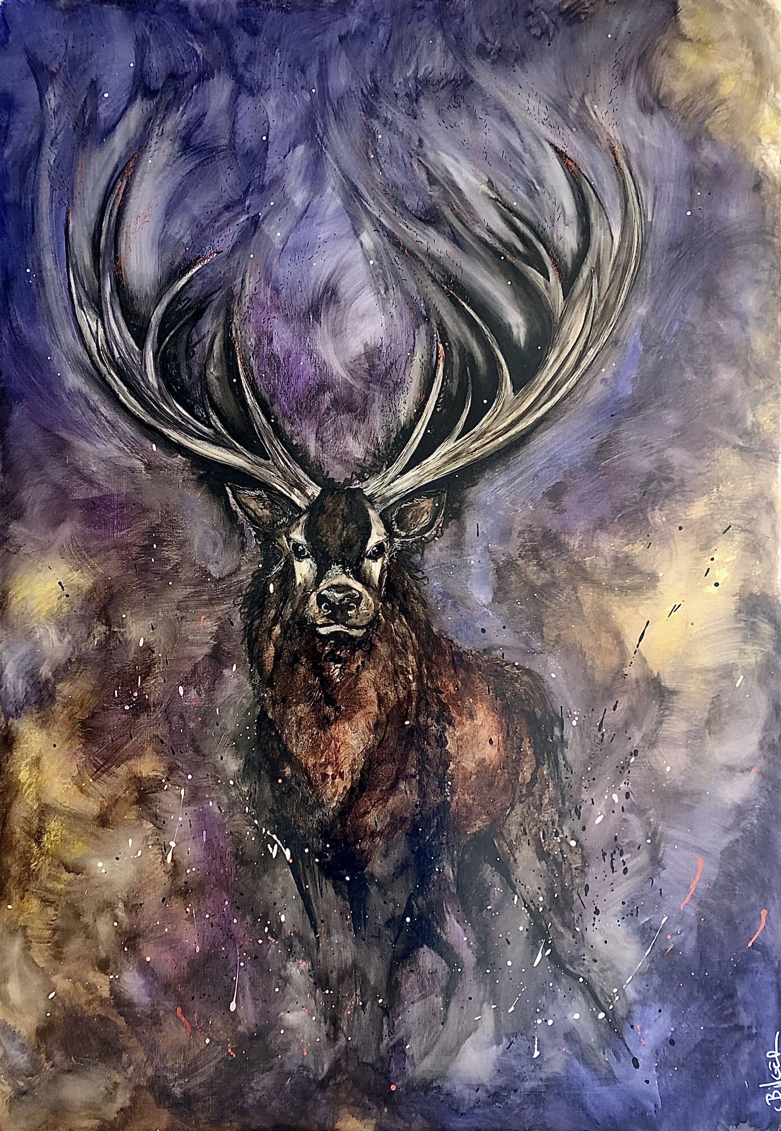 "Cerf", 2019. Disponible: 400 euros, 81X120cm. Il est comme l'un des esprits de la forêt, grand, fort et puissant. Encre acrylique, acrylique, encre de chine, feutres peinture sur toile de lin.