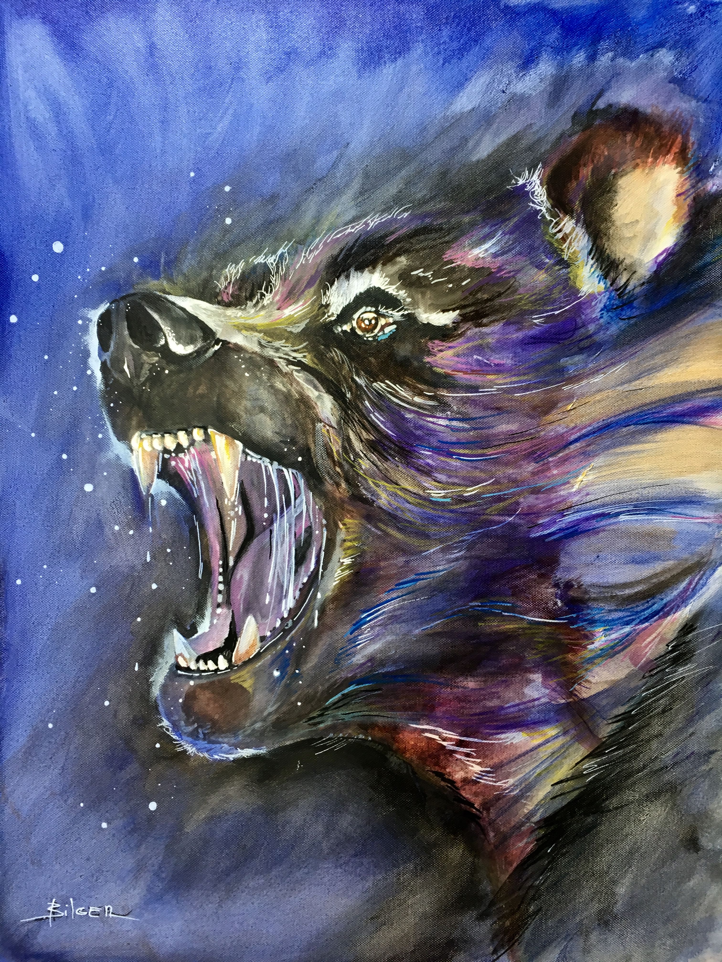 "Bears", 2020. Disponible: 250 euros, 50X65cm. Le roi des plaines. Encre acrylique, acrylique, encre de chine, feutres peinture sur toile de lin.