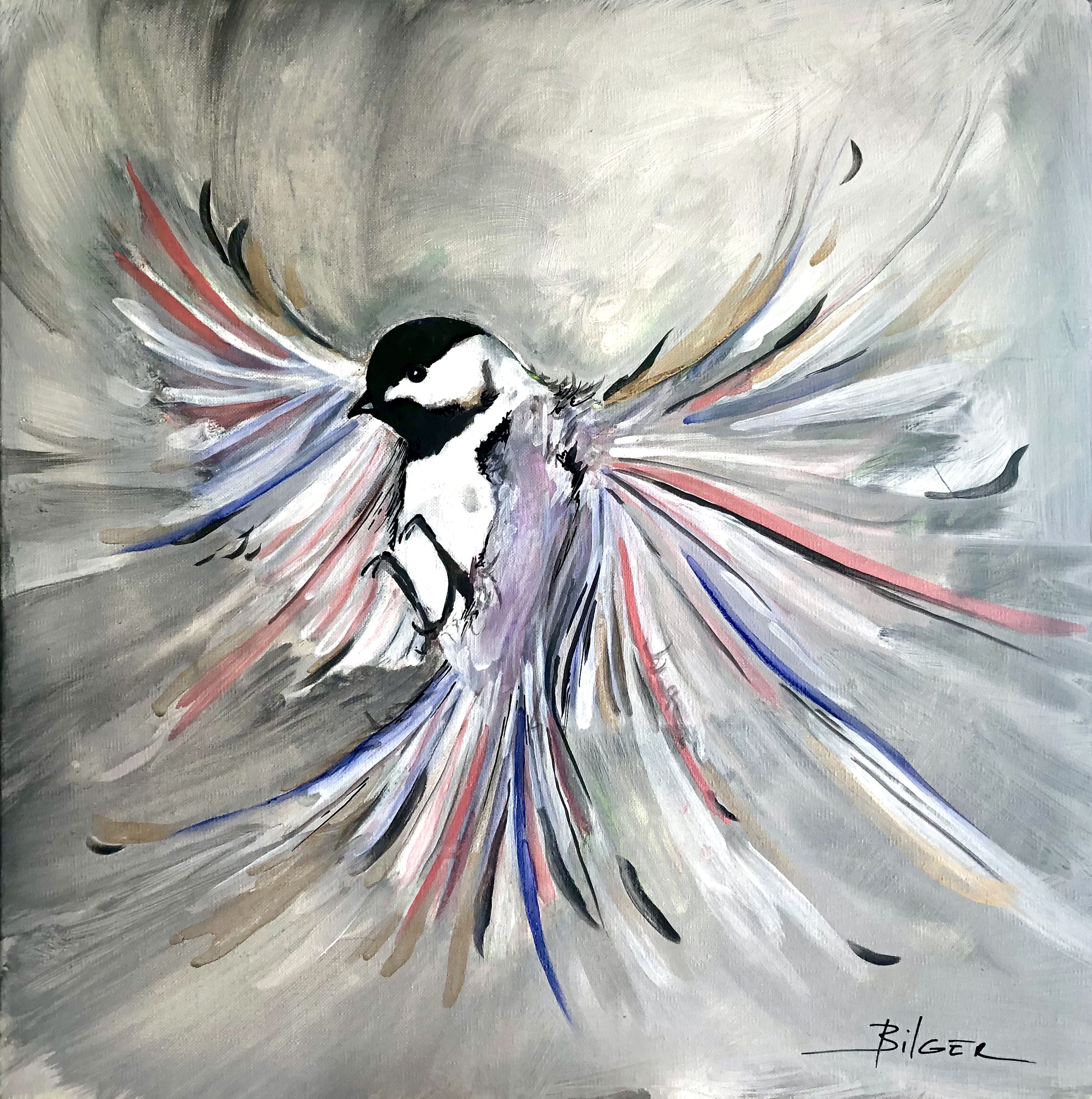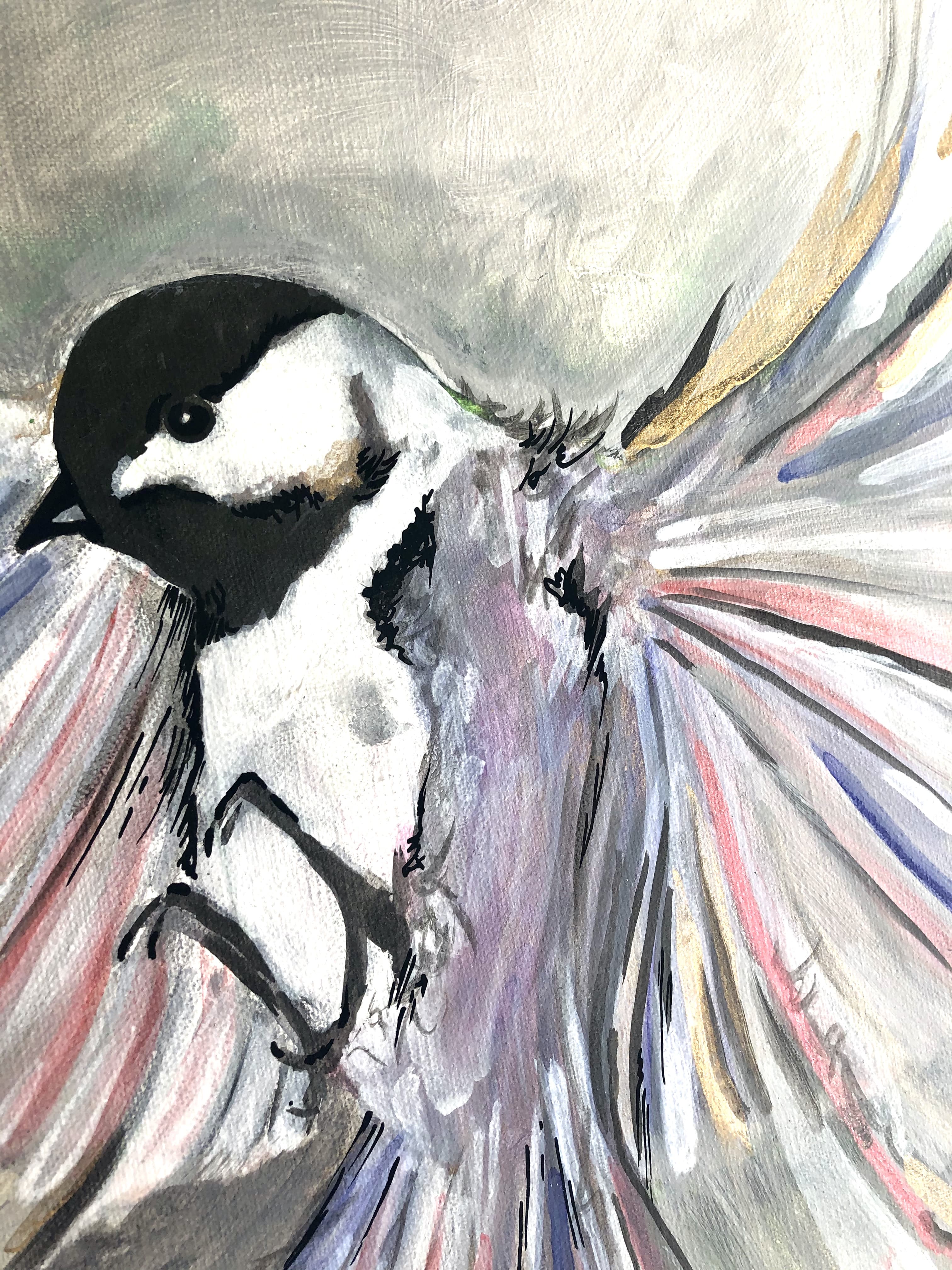 "Bird", 2020. Disponible: 150 euros, 40X40cm. En mouvement, ils le sont toujours. Encre acrylique, acrylique, feutres peinture sur toile de lin.
