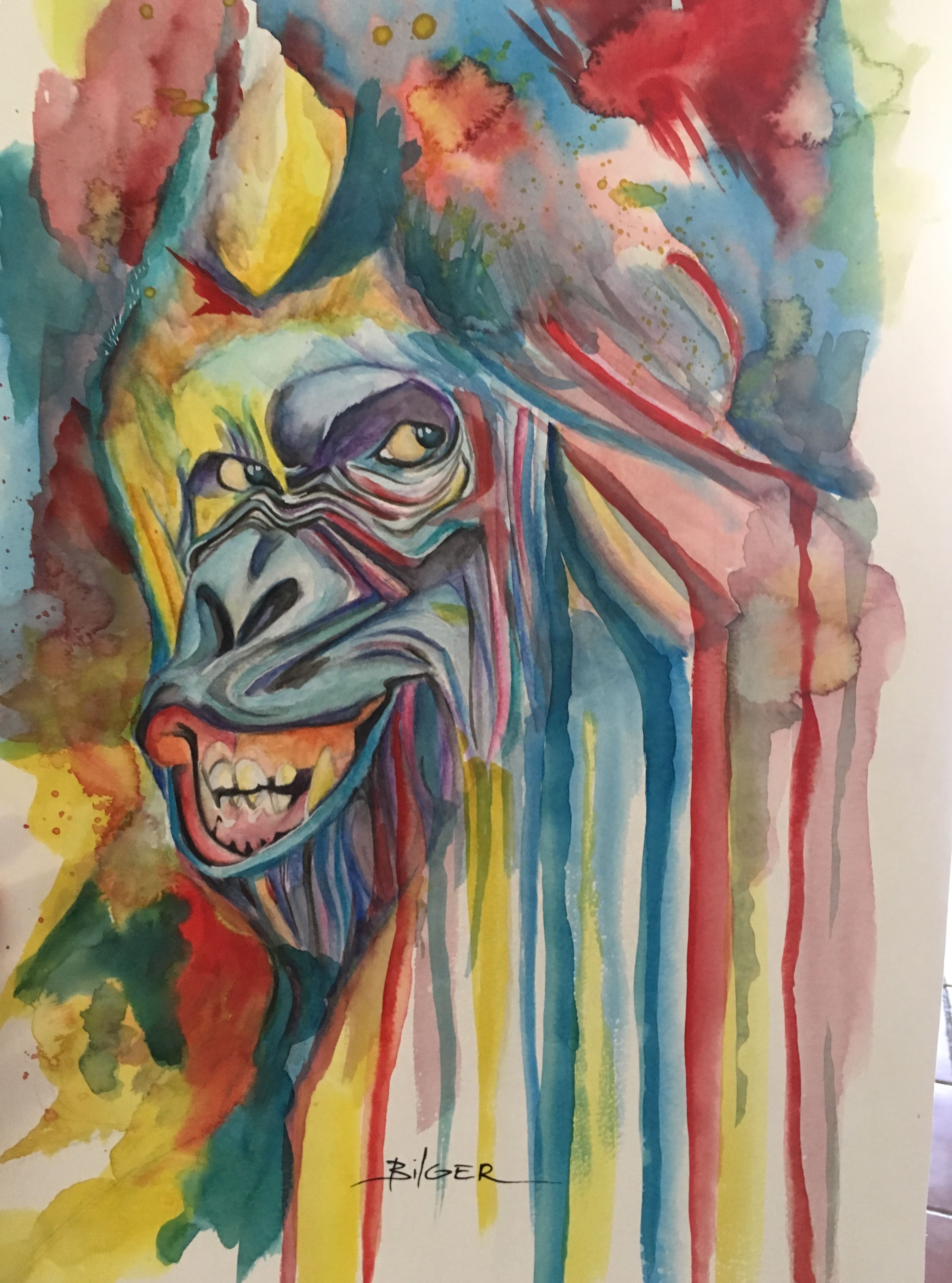 "Colored monkey", 2020. Disponible: 200 euros. 21X30cm, aquarelle sur support papier aquarelle 300gr de haute qualité. Un singe rockn'roll? pourquoi pas!!.