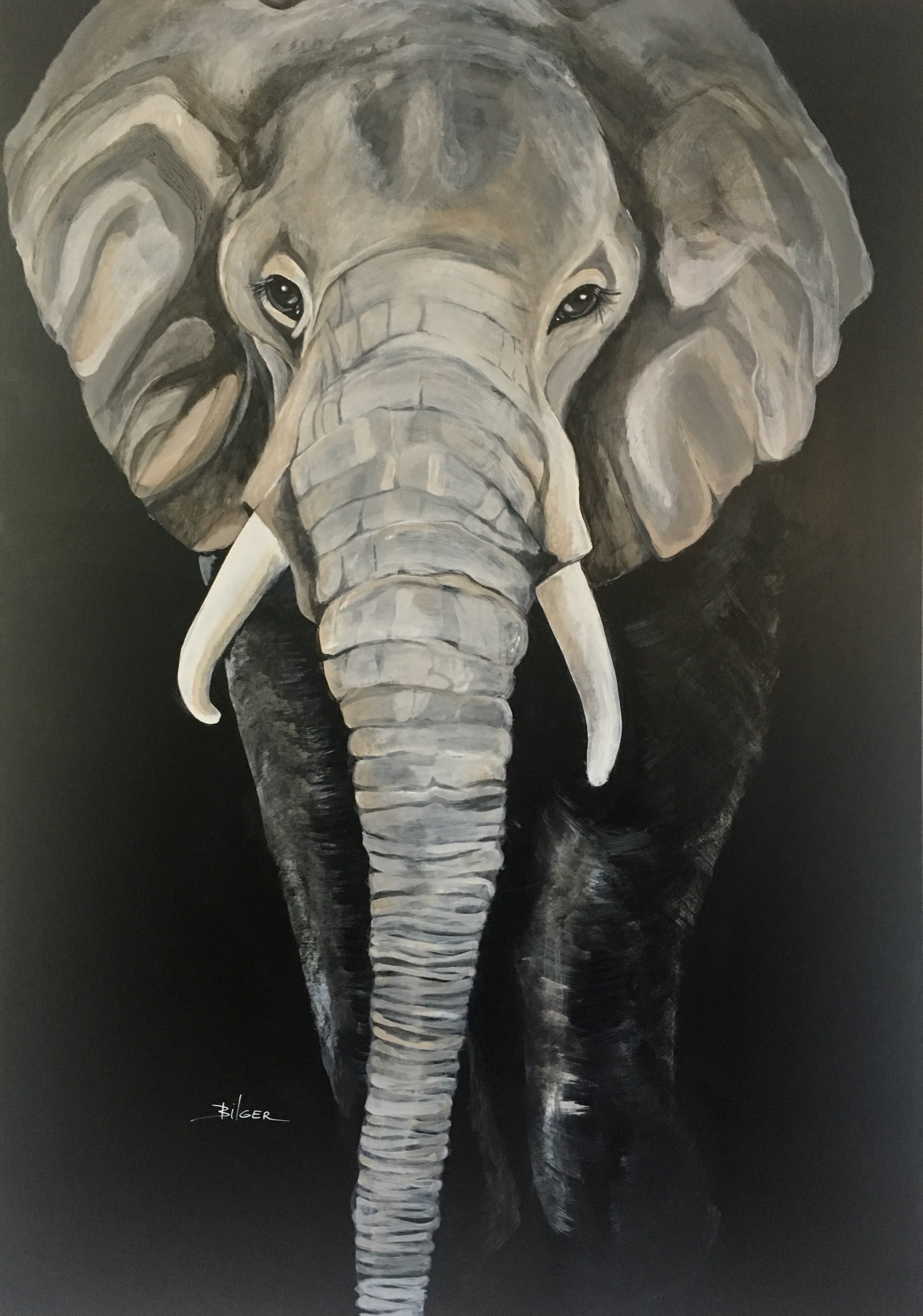 "Elephant", 2020. 80X120cm, acrylique et brou de noix sur toile de lin. Un géant puissant, intelligent et docile.