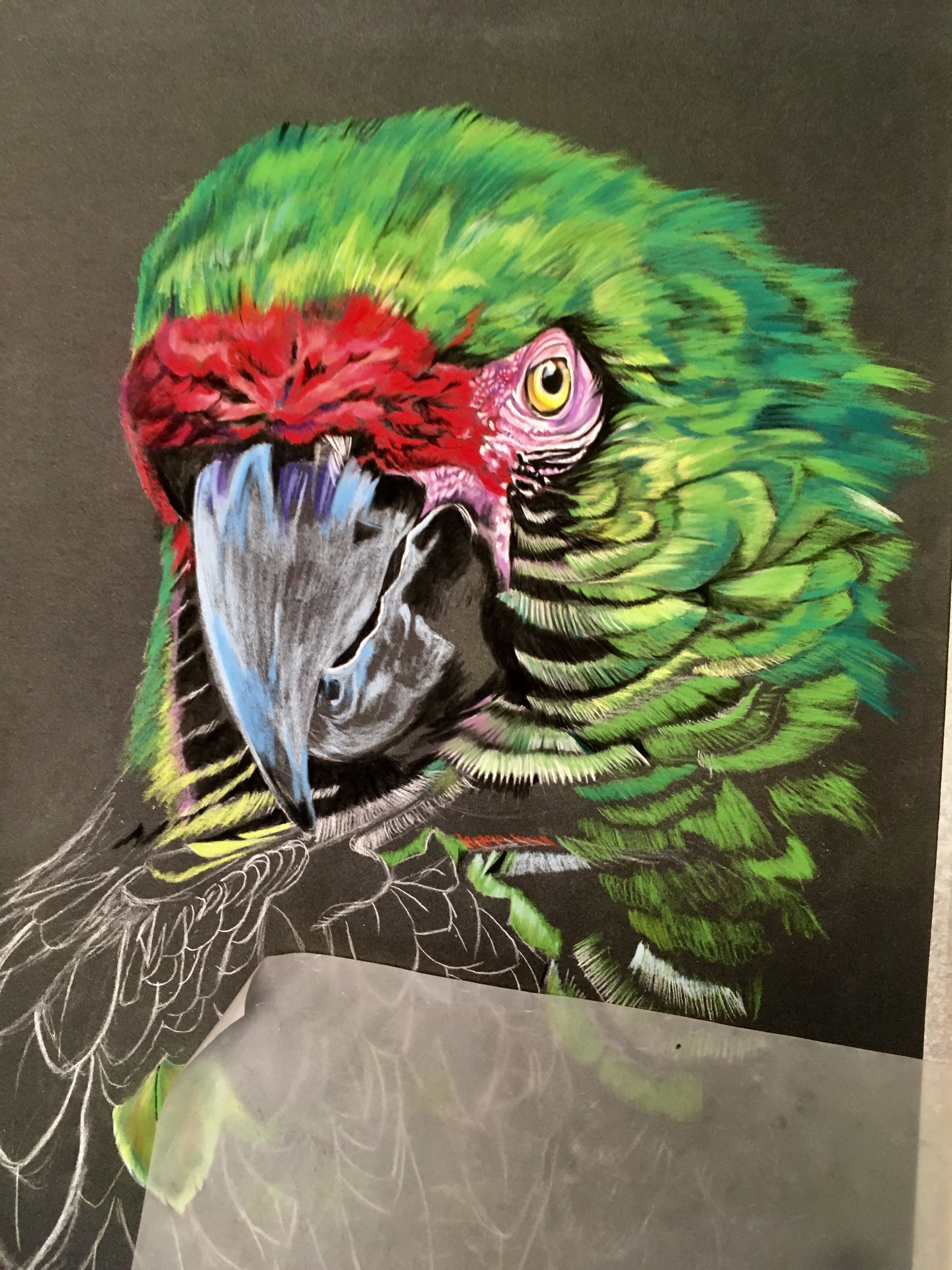 "PARROT", 2021.DISPO. 50X70CM sur papier pastelmat gris anthracite. Il est la représentation même de la couleur.